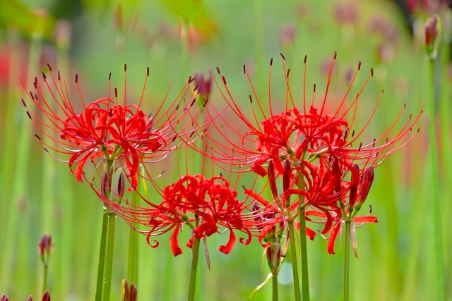日本ではお秋の彼岸のころに田んぼの畔や畑の端に、情熱的で艶めかしい赤色の花がたくさん咲くのが見られますよね。花の咲くころは、葉っぱはなく、また、その花はなんとも不思議な姿ですね。