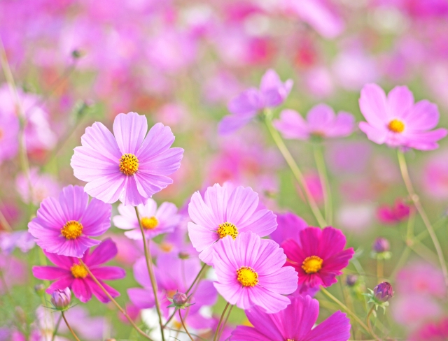 桜の花に似ていることから「秋桜」とも呼ばれています。コスモス畑で咲いている様子が宇宙に散らばる星のようだから「コスモス」と名付けられたそうです。